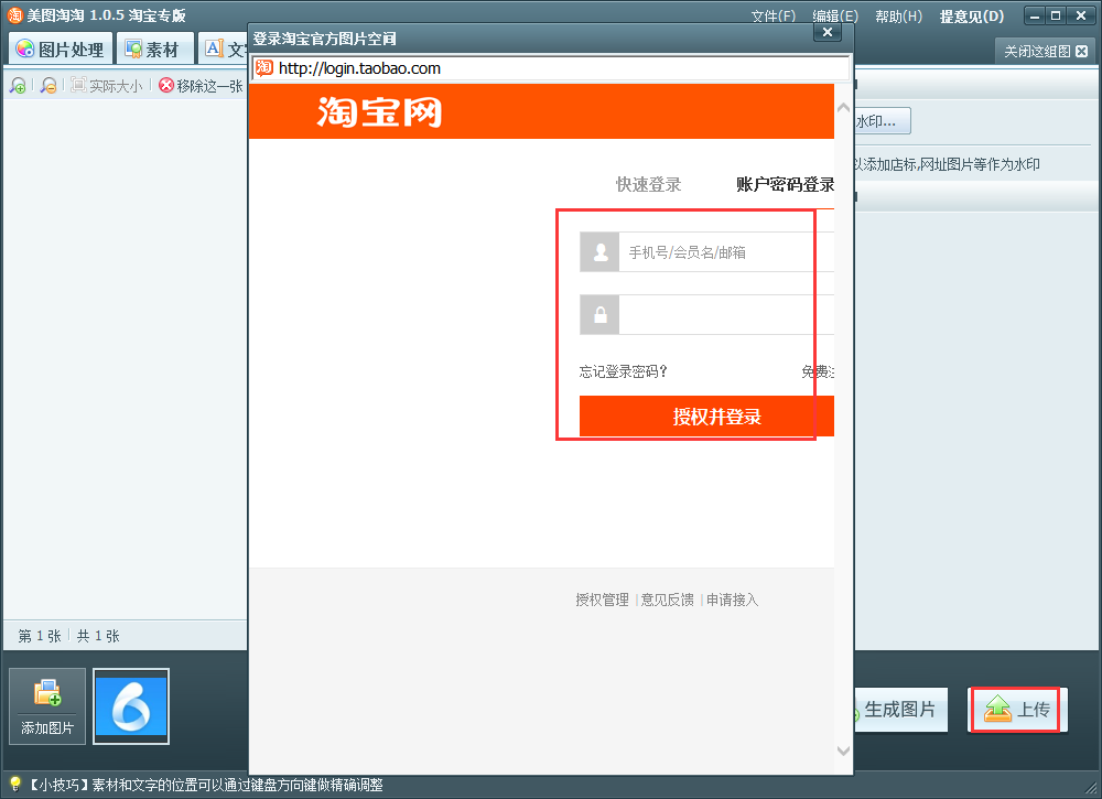 美圖淘淘與淘寶網(wǎng)官方合作,提供一鍵將多張圖片批量上傳淘寶官方圖片空間,直接返回圖片地址。讓圖片批量處理、上傳一次完成!
