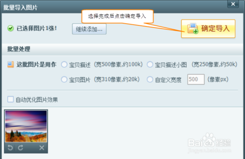 第三步:選擇完畢后點(diǎn)擊“打開”,按照圖片用途來選擇您需要的尺寸大小,也可以自定義圖片寬度來控制圖片大小;鼠標(biāo)懸停在圖片上,會看到選擇按鈕和刪除按鈕;在選擇和調(diào)整完畢后,就可以點(diǎn)擊右上角的“確定”按鈕,完成導(dǎo)入。