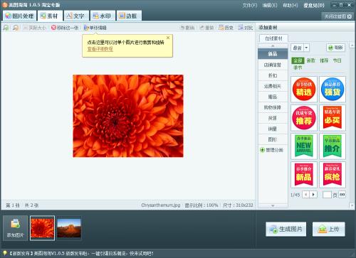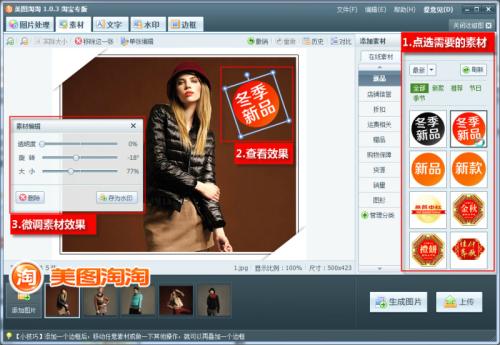 美圖淘淘軟件是一款專為網(wǎng)店賣家設(shè)計的圖片處理軟件,預(yù)置海量網(wǎng)店專用素材,可同時處理多張圖片,所有操作都是“一步動作,批量同步到所有圖片”。