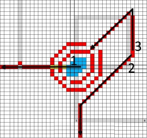 1、 三進(jìn)三出的保證是,以"1,2,3,4,5"的check點(diǎn)箭頭+終點(diǎn)6,共6個(gè)點(diǎn),分組包圍成 1/3/5 圈內(nèi) + 2/4/6 圈外,就能實(shí)現(xiàn),稍后上圖。