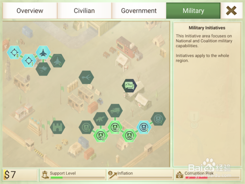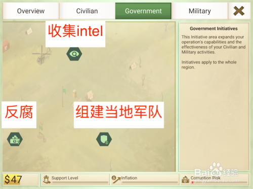 3)當(dāng)?shù)孛癖好癖谡x項下建造。民兵可以提升地區(qū)的安全,使其更難被叛軍占領(lǐng),但是購買民兵會降低支持率。