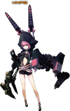 外觀為穿著大衣,粉色頭發(fā)的幼女,連衣帽上有對形似兔耳的機械突起,平常操作左右兩邊的大型機械手臂來輔助行動,并且能自由操縱數(shù)量龐大的兔型機器“ミニ?ラビット”(迷你兔)發(fā)射光束攻擊敵人。在無邪的外貌下隱藏著極為殘忍且毫無憐憫的性格,煽動娜娜并將她移往月面宮殿,自身留下來阻擋BRS。最后因操作的兔型機器幾乎被BRS砍光殆盡而落敗,并遭WRS吞噬。