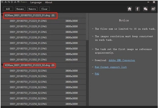 1、單反用戶:打開 Raw+,點(diǎn)擊左上角的“添加”,選擇同一場(chǎng)景高速連拍的 Raw 文件導(dǎo)入Raw+(至少兩張以上,最高支持 16 張)。