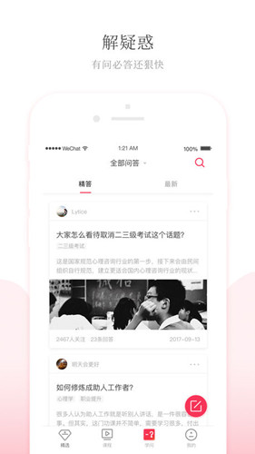 心圈子是為用戶打造的在線交流小組,這里會入駐大批心理咨詢師、心理學(xué)愛好者,進(jìn)行專業(yè)知識的探討、朋輩督導(dǎo)、答疑解惑。