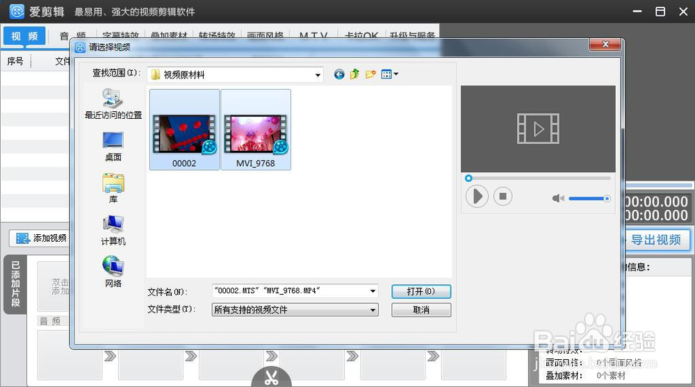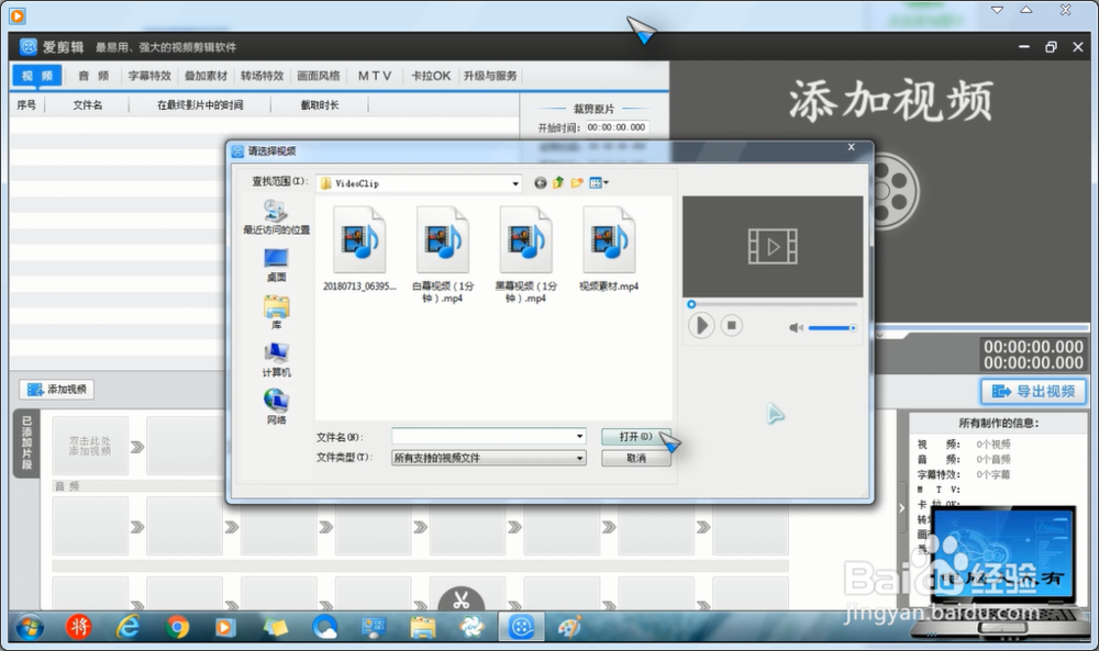 添加視頻(也可以將視頻拖拽進來加載)→打開。