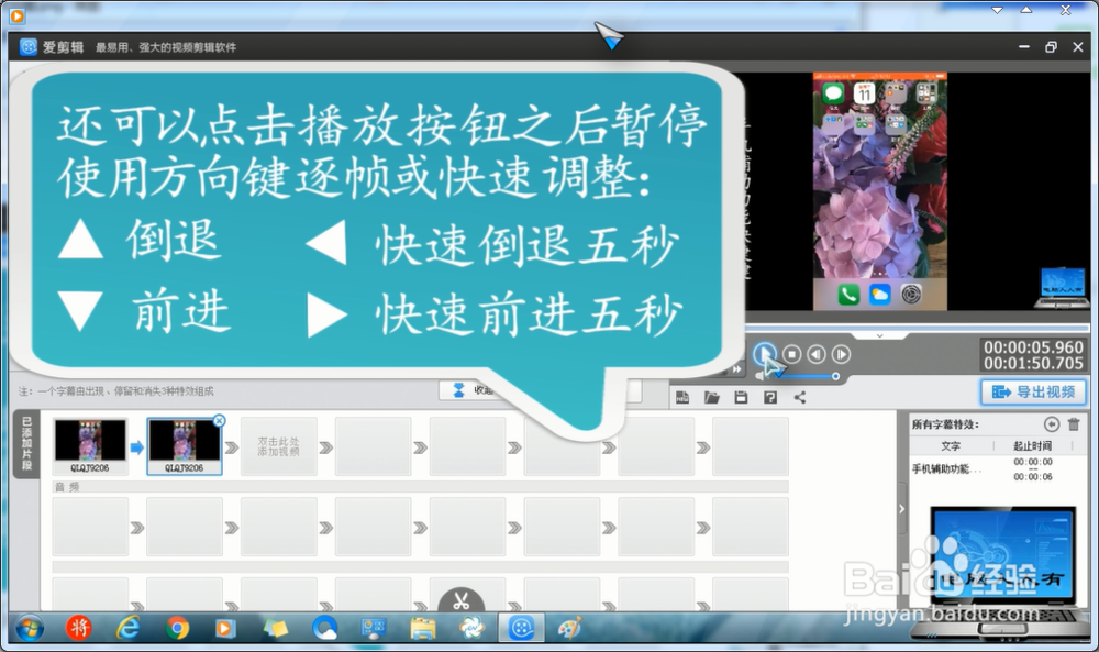 同樣,預覽視頻這里也有播放按鈕和時間軸查看視頻兩種方式,除此之外,還可以使用方向鍵逐幀(進、退),或者5秒(前進、倒退)查看編輯視頻。