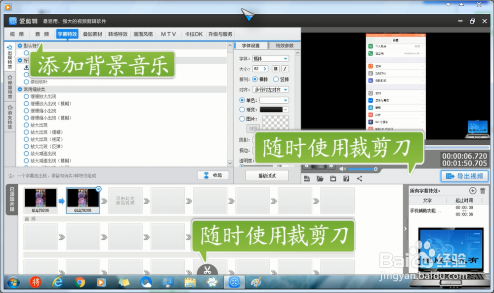 字幕特效→雙擊編輯框打開字幕編輯框→輸入文字→定義方位(可以翻轉(zhuǎn)等操作)→也可以加載特效→設置顏色和時間(默認6秒→進入2秒、停留2秒、退出2秒)。