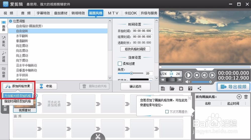 選擇好想要添加的特效后,點擊“添加風格效果”按鈕,可以選擇“為當前片段添加風格”或“指定時間段添加風格”,添加成功后,可在“效果設置”中設置角度,設置成功后,選擇確認修改,如圖所示