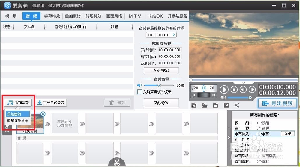音頻:進入音頻界面后,點擊“添加音頻”可選擇添加“音效”或“背景音樂”,如圖所示