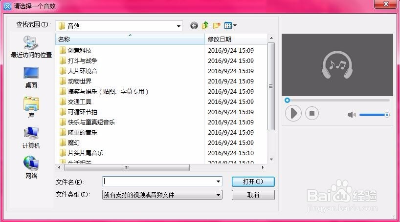 選擇添加“音效”或“背景音樂”,會彈出素材窗口,根據(jù)需求選擇自己需要的素材,也可下載素材添加,如圖所示