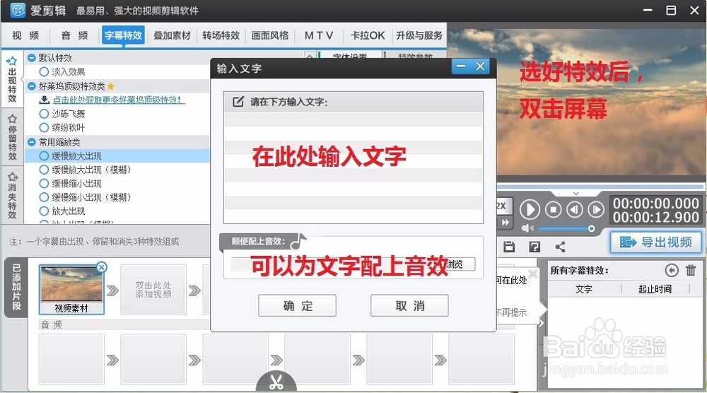 選擇好特效后,雙擊視頻,添加文字,還可為配的文字添加音效,如圖所示