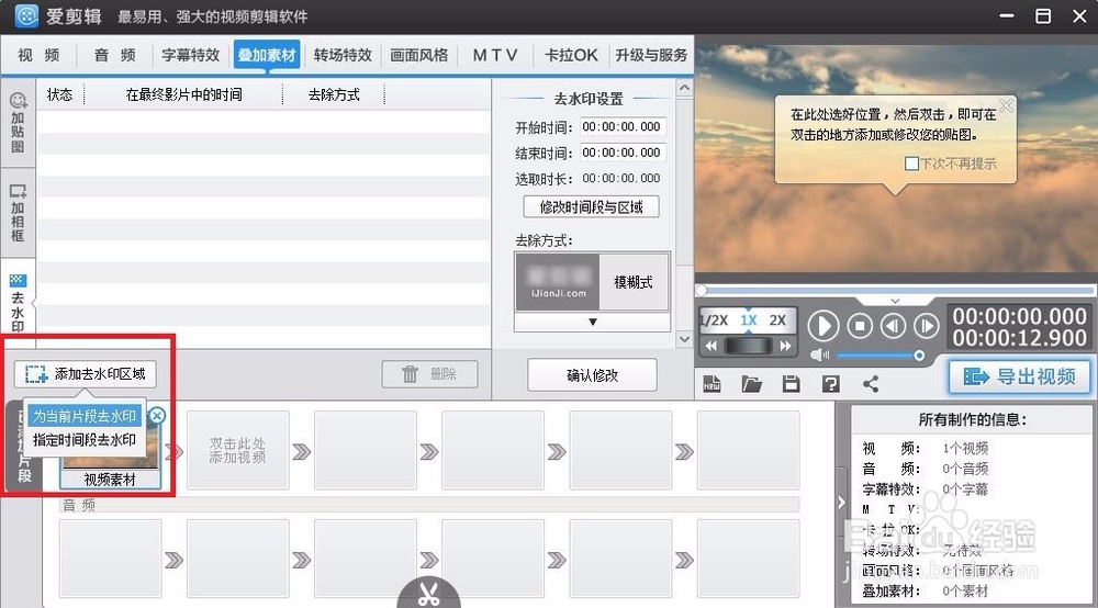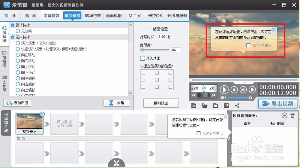 點擊疊加素材→可以添加圖片水印,固定的圖片,自定義上傳的圖片等素材(可以縮放、轉(zhuǎn)向、復制、剪切、粘貼等操作)→勿忘設置時間(默認只顯示1秒)。