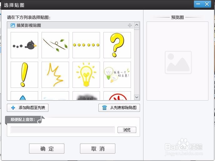 選擇成功后,會出現(xiàn)貼圖或相框素材庫,根據(jù)喜好進行選擇,也可為此特效配上音樂,如圖所示