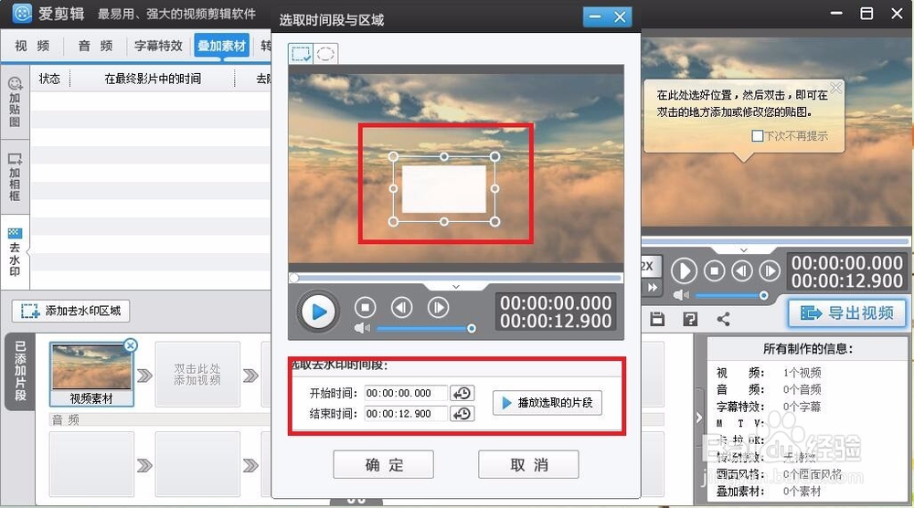 選擇好“為當前片段去水印”或“指定時間段去水印”后,現(xiàn)彈出的“選取時間段與區(qū)域”窗口中,可是設置添加馬賽克位置及添加馬賽克時間,如圖所示