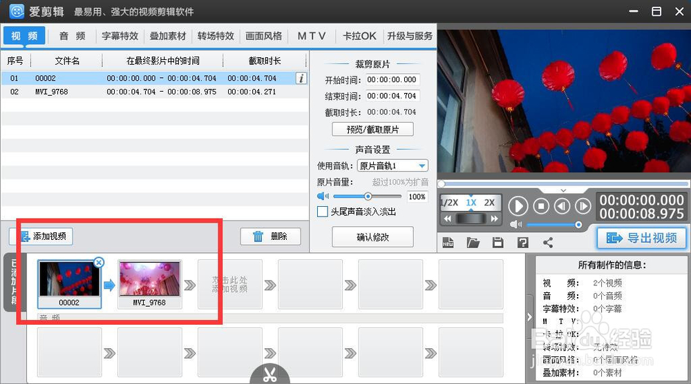 視頻導入之后,會自動分配到前兩個視頻框中。