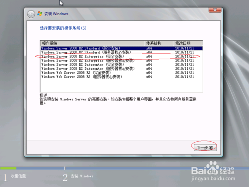 3、在這里可選擇要安裝的操作系統(tǒng)為Windows Server 2008 R2 x64企業(yè)版,如圖。當然也可選擇其他版本、功能上有所區(qū)別,請查閱相關資料。