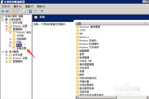 2、在打開的本地組策略編輯器,依次點(diǎn)擊“計(jì)算機(jī)配置”---“管理模板”---“系統(tǒng)”如圖所示