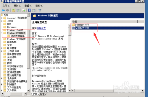 3、在“系統(tǒng)”下點(diǎn)擊“windows 時(shí)間服務(wù)”選擇“全局配置設(shè)置”右邊有相關(guān)的解釋,可以根據(jù)具體需要進(jìn)行設(shè)置