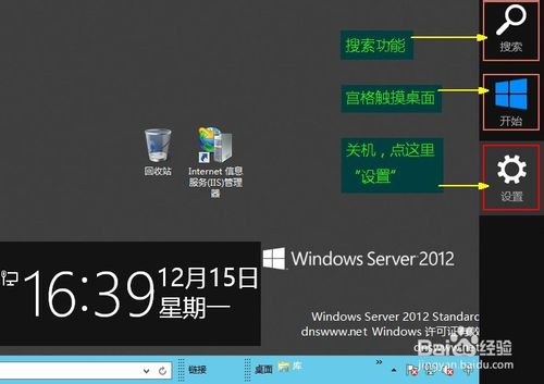 2、桌面會(huì)同時(shí)出現(xiàn)兩個(gè)灰色方塊,左邊是本服務(wù)器當(dāng)前時(shí)間,右邊豎條的分別是“搜索功能”“宮格觸摸界面”“設(shè)置”,我們要操作關(guān)機(jī),所以單擊“設(shè)置”;