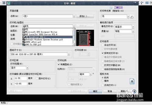 4、在“打印機/繪圖儀”下面有個“名稱”,點擊有一系列的下拉菜單,找打?qū)拇蛴C。