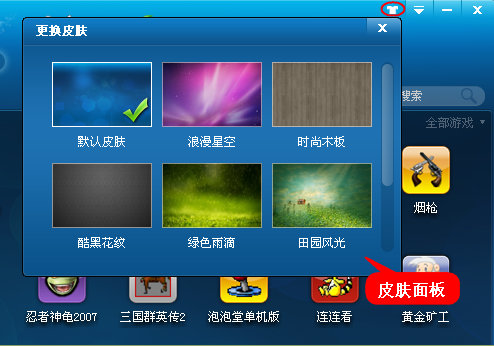 如何換膚?一、點(diǎn)擊快吧游戲右上角的“換膚”按鈕調(diào)出更換皮膚面板,如圖1