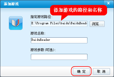 四、點(diǎn)擊“打開(kāi)”后,會(huì)彈出“添加游戲”窗口,在窗口里有所要添加游戲的圖標(biāo)、路徑和游戲名稱(chēng),點(diǎn)擊“確定”即可,如圖4