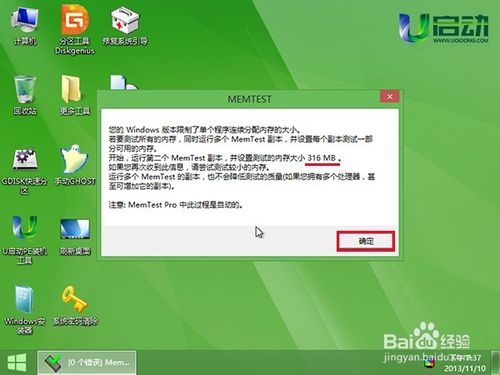 此時(shí)會(huì)彈出一個(gè)提示窗口,我們可以看到建議設(shè)置測(cè)試內(nèi)存大小316MB(這個(gè)值會(huì)因不同的內(nèi)存而改變),然后點(diǎn)擊“確定”按鈕,如下圖所示: