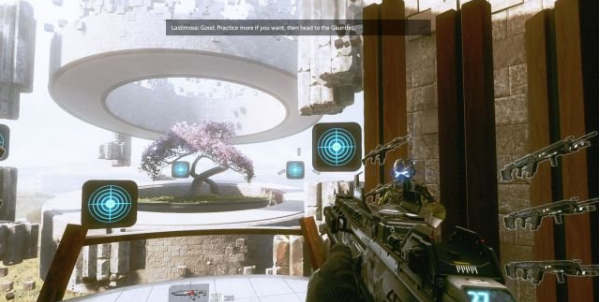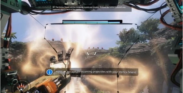 step15.首先要學(xué)習(xí)一些泰坦的操作,摁住鼠標(biāo)滑輪使用漩渦盾,吸住敵人的子彈,瞄準(zhǔn)山上的機(jī)械兵,松開(kāi)鼠標(biāo)滑輪就可以將它們的子彈反彈回去。