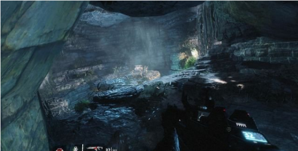 step6.進(jìn)入到山谷內(nèi),注意巖洞上會(huì)出現(xiàn)無(wú)人機(jī),兩三槍就可以將它們擊落。