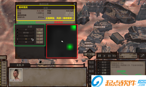 點擊右下角勘探,可勘探處附近資源情況。土地類型影響種植種類,風(fēng)速影響風(fēng)力發(fā)電,水、石頭、鐵、銅是資源豐富度,肥沃度影響作物收成