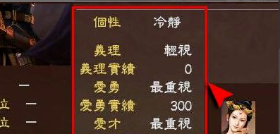 義理高的武將不容易背叛,并欣賞重視義理行動(dòng)的武將。愛(ài)勇高的武將則欣賞在軍事會(huì)立下成果的武將。愛(ài)才高的武將欣賞在內(nèi)政,計(jì)略,外交立下成果的武將。對(duì)應(yīng)價(jià)值觀的就是 實(shí)績(jī),會(huì)因各種行動(dòng)增減。