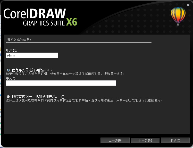 3. 選擇我有序列號并輸入序列號。如果沒有的話可以先選擇試用。然后點(diǎn)擊下一步。