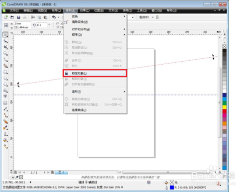 調(diào)整完畢后,如需要鎖定該條線,即點(diǎn)擊菜單欄上“排列”按鈕,在下拉菜單中選擇鎖定對象即可,那么該輔助線不能被移動或更改。
