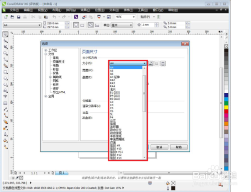 在彈出的對話框中選擇“頁面尺寸”。點(diǎn)擊“大小”右側(cè)的按鈕,在下拉菜單中可以設(shè)置紙張大小。