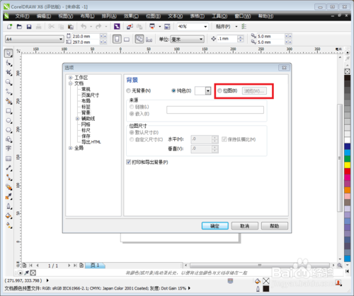 點(diǎn)擊該對話框中下方的“背景”按鈕,可以對頁面背景進(jìn)設(shè)置,點(diǎn)擊右側(cè)按鈕“位圖”。