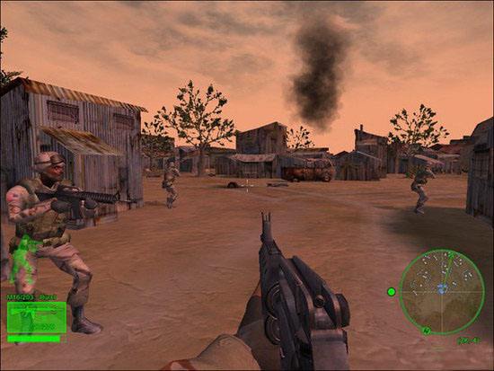 山谷村莊戰(zhàn)。點shift鍵上車,和隊友一起攻擊前進,路上把幾個摩托兵和一架直升機滅掉。到達敵村莊后,4名隊友會分別包抄左右兩邊,主角只需要配合隊友全滅村莊內敵人即可。確認沒有遺漏后,在一個木屋中發(fā)現(xiàn)一個像洗碗機一樣的東西,是GPS系統(tǒng),幾槍打爆,過關。本關難度很小,隊友幾乎包辦了一切,建議用M16,難度1星。