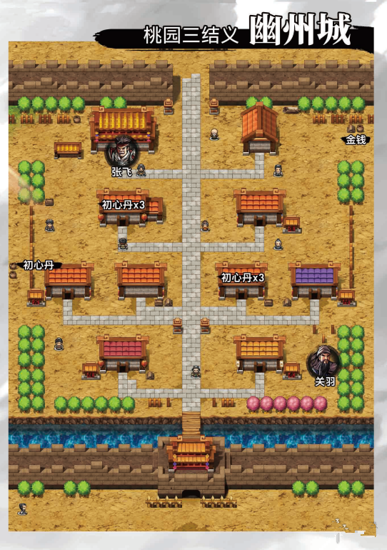 開(kāi)場(chǎng)動(dòng)畫(huà)結(jié)束后,畫(huà)面轉(zhuǎn)到劉備所在小屋,一番劇情對(duì)話之后介紹操作方法。出門(mén)后與年輕人撞在一起,對(duì)話得知太守劉焉正招募將士。城內(nèi)北面進(jìn)入宮殿前,張飛突然出現(xiàn),對(duì)話并加入隊(duì)伍。與右下角武器店右側(cè)之人對(duì)話,得知是關(guān)羽,對(duì)話后關(guān)羽加入隊(duì)伍。劉關(guān)張三人開(kāi)始結(jié)拜。動(dòng)畫(huà)過(guò)后,獲得造詣「桃園結(jié)義」。
