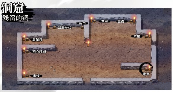 熟悉戰(zhàn)斗操作后,前往北方山洞進(jìn)行探索。山洞內(nèi)有大量初始補(bǔ)給品和部分裝備,山洞內(nèi)右下角有位老人,與其對(duì)話得知在洞穴內(nèi)與黃巾賊戰(zhàn)斗可獲得任務(wù)道具「殘留的銅塊」。獲得該道具后,交于老人,老人隨后離開(kāi)。(在此洞穴中遇敵,遇到黃巾賊時(shí),可有幾率獲得該道具)。