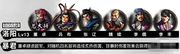 此戰(zhàn)難度較高,等級(jí)建議Lv12以上(忌心計(jì)習(xí)得必要)。戰(zhàn)斗分為兩個(gè)階段,主要的戰(zhàn)斗為第一階段。呂布傷害極高,董卓的普攻有灼燒傷害,武將技「暴君」的群體傷害也不容忽視,張飛極容易被計(jì)策限制。