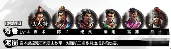 此戰(zhàn)為6人的BOSS戰(zhàn),城防LV2。建議等級(jí)LV13以上。需注意袁術(shù)的武將技「泥崩」,群體傷害。誅心計(jì)和單體水計(jì)的威脅也較大。紀(jì)靈速度較快,第一回合強(qiáng)制先手布置魚(yú)鱗陣。魚(yú)鱗陣的弱點(diǎn)在于隊(duì)伍的一號(hào)和五號(hào)位,被攻擊會(huì)100%暴擊,可優(yōu)先擊殺陳蘭和兵士來(lái)打破魚(yú)鱗陣(陣型存在時(shí),若兩名以上將士陣亡,陣法自動(dòng)解散)。糜竺的輔助作用十分突出,破陣后袁術(shù)軍的傷害非常有限,做好兵力恢復(fù),可選擇擊殺袁術(shù),也可以擊殺其他武將,最后解決袁術(shù)。