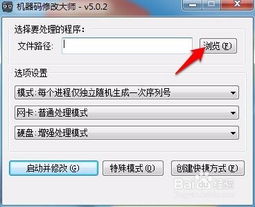 4.打開(kāi)軟件后點(diǎn)擊左上角的瀏覽-選擇需要改機(jī)器碼的軟件-選項(xiàng)設(shè)置默認(rèn)(也可以按自己的需求選擇)-啟用并修改