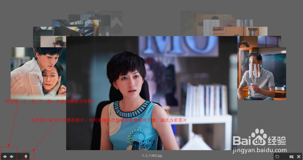 在審閱模式下,直接按鍵盤方向鍵,則可逐張瀏覽圖片,若當(dāng)前圖片為不需要的圖片是,只需按向下鍵即可淘汰該圖片。同時,在審閱模式的左下角也有操作按鈕。
