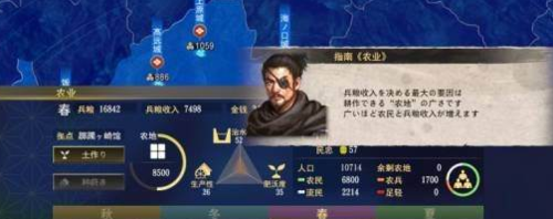 而在本作中的農(nóng)業(yè),除了通過(guò)「開(kāi)墾」擴(kuò)大農(nóng)地以外,還有各種為了增加收獲的「支援」。每個(gè)據(jù)點(diǎn)都會(huì)以「肥沃度」、「產(chǎn)能」、「治水」等標(biāo)示農(nóng)業(yè)發(fā)展的程度,通過(guò)支援提升這些指標(biāo),就能增加收成。春天時(shí)給予農(nóng)民品質(zhì)良好的種子,讓他們「播種」,夏天要實(shí)行「灌溉」等,根據(jù)季節(jié)不同,能夠?qū)嵭械恼邥?huì)有變化,所以一年間有計(jì)劃地推進(jìn)農(nóng)業(yè)是十分重要的。在「支援」中,每個(gè)項(xiàng)目的實(shí)行次數(shù)是有限制的,為了增加次數(shù),需要使用專用的「方策」。例如為了實(shí)施方策,用以增加提高據(jù)點(diǎn)肥沃度的「肥料」的使用次數(shù),就必須在領(lǐng)土內(nèi)增加能夠有效取得原料的「漁港」或「馬產(chǎn)地」 。 像這樣活用「評(píng)定」或「方策」,增加農(nóng)業(yè)支援的手段,強(qiáng)化自身勢(shì)力。