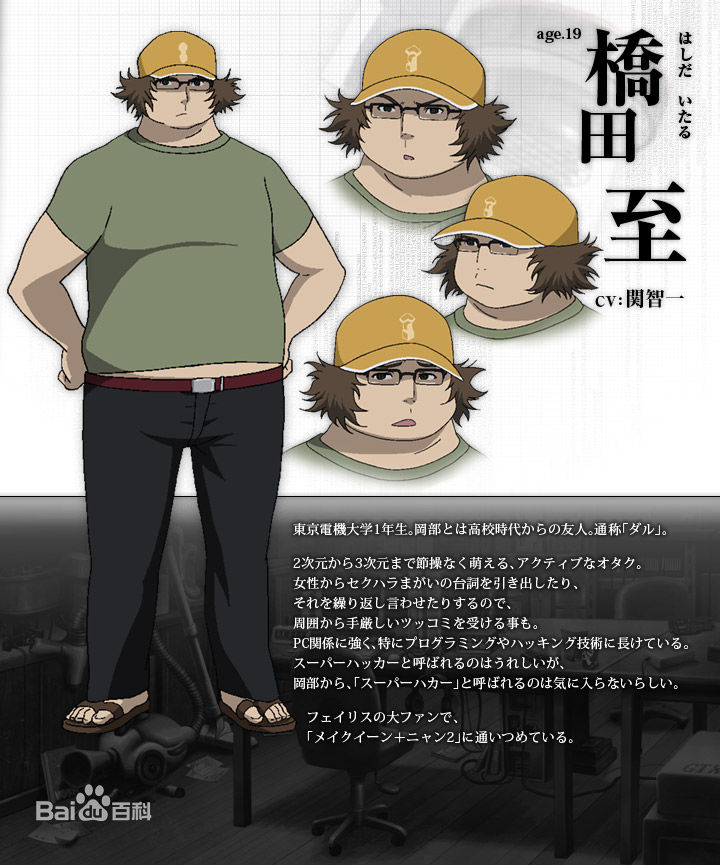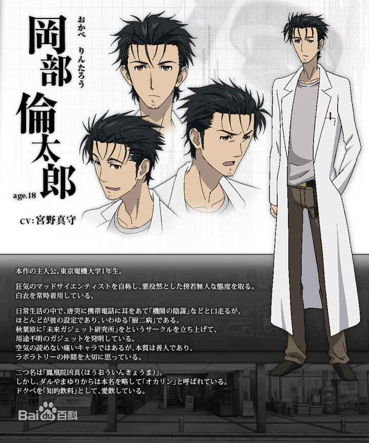 本作男主角。老家是開蔬果店的。屬性傲嬌,同時是嚴重的中二病患者。有時會用意義不明的"這一切都是SteinsGate的選擇"(Steins在德語中是"石頭" Gate是"門" 但整句并無意義)或是"El psy congroo"(使用了很久的話,能夠自我暗示,使自己鎮(zhèn)靜下來)作句尾.不過實際上做的是在“未來道具研究所”里制作一些奇怪的發(fā)明。