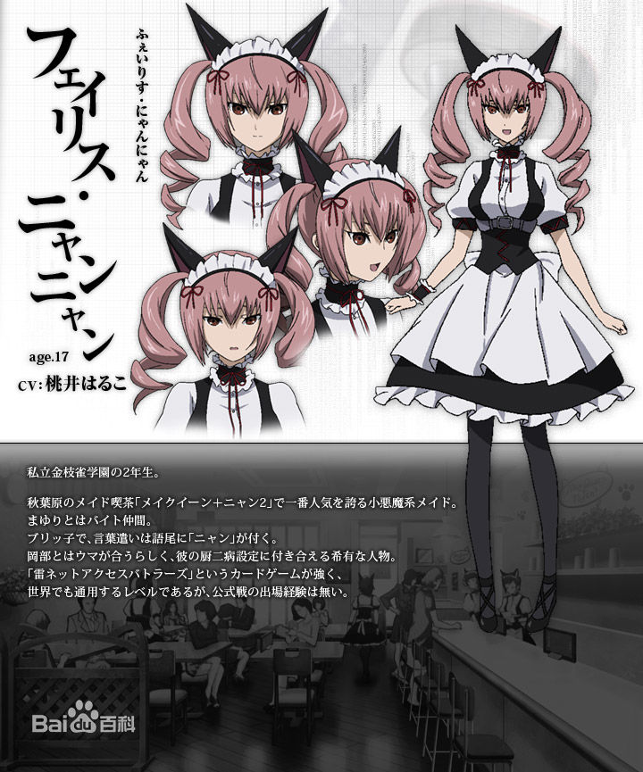 是秋葉原的大人氣貓耳女仆咖啡廳的店主,秋葉原萌化的執(zhí)行者。因為平時就戴著貓耳,使用著動畫中常出現(xiàn)的“喵喵~”的口癖。有著只要注視對方眼睛就知道內(nèi)心想法的特殊能力(其實是對他人的心情十分敏感)。由于貓耳的萌要素和能力使她在打工的地方贏得了 No.1 的人氣,是那種玩弄男人內(nèi)心的小惡魔。
