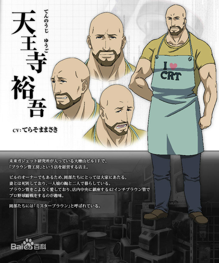 岡部社團樓下的電器店“映像管工房”的店長,同時也是該棟大樓的房東,十分的強壯。有長期逗留法國的經(jīng)驗。因為映像管又稱布朗管(名稱取自于發(fā)明映像管的諾貝爾物理學獎得主卡爾·費迪南德·布勞恩。)。