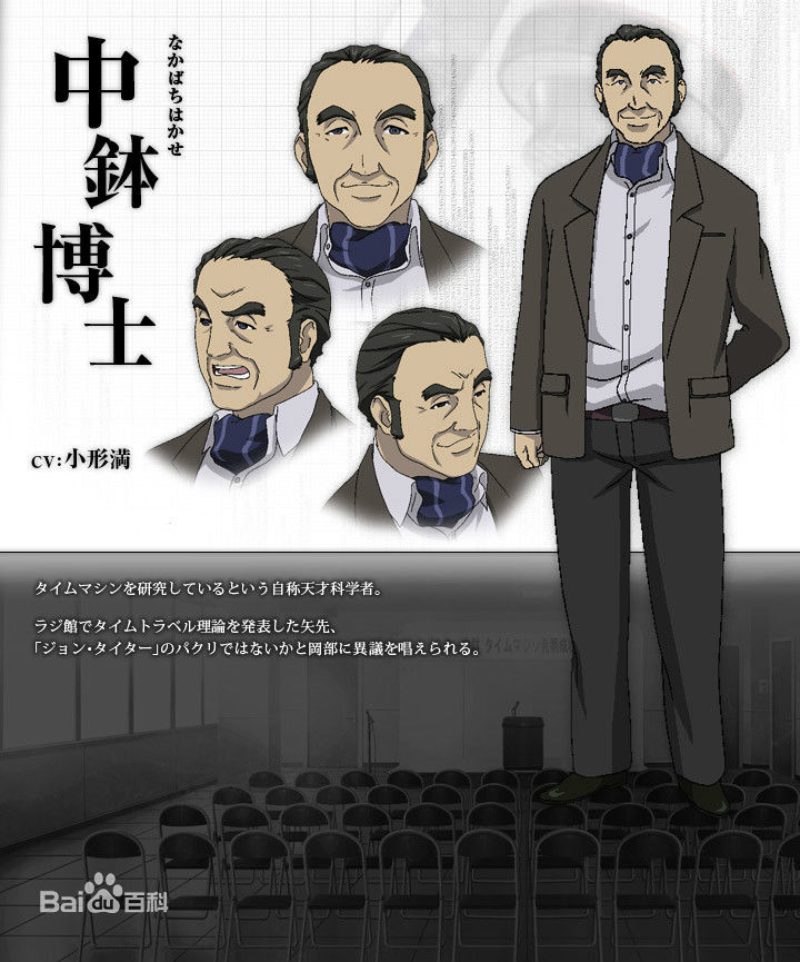 職業(yè)是科學家,牧瀨紅莉棲的父親。自稱獲得多項專利、授予諾貝爾獎的物理學家。同時也是牧瀬紅莉棲的父親。從前與紅莉棲非常親近,但因為強烈的自尊心無法接受成就超越自己的女兒而逐漸遠離紅莉棲,最後甚至被學術(shù)界除名。是紅莉棲遭刺殺案件的相關(guān)人物,從案發(fā)現(xiàn)場奪取了紅莉棲寫的有關(guān)「時間機器理論」的論文,并打算搭機到俄羅斯尋求贊助,原本該班客機會因為貨倉失事而使得中缽搶奪的紅莉棲寫的有關(guān)「時間機器理論」的論文燒毀,但卻因為先前紅莉棲無意中撿了真由里掉落的金屬烏帕放進了論文的袋子中,使得中缽在機場被金屬探測器攔了下來,帶上了飛機而順利的保存了下來。中缽以自己的名義發(fā)表了「時間機器理論」的論文,造成了β世界線中各國爭奪時間機器而釀成的第三次世界大戰(zhàn)。