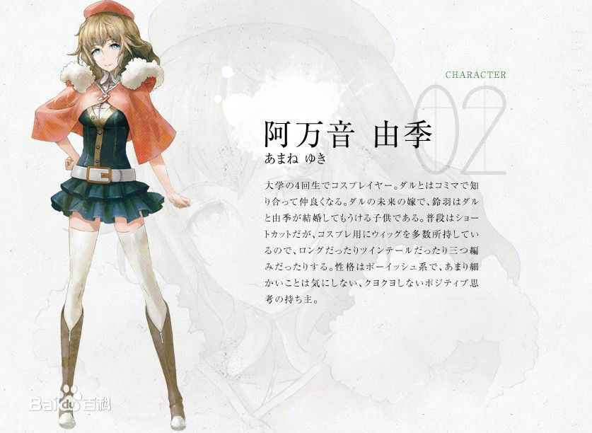 大學時代是個超人氣美少女COS愛好者,按鈴羽所述她當時是個挺有名氣的(喜歡)COSPLAY的腐女,和鈴羽的父親桶子君(橋田至)于Comic Market里命運般地邂逅。由季是桶子未來的老婆,而鈴羽就是兩人的孩子。