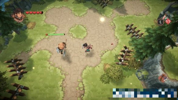 來(lái)到下個(gè)場(chǎng)景,這里有兩名敵人,其中的錘兵會(huì)釋放一個(gè)自動(dòng)發(fā)射弓箭的裝置,對(duì)玩家威脅較大,需要優(yōu)先解決掉。