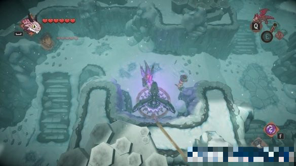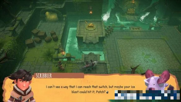 來(lái)到下個(gè)場(chǎng)景,這里的開(kāi)關(guān)中間的路斷開(kāi)了,可以使用龍的遠(yuǎn)程普攻將開(kāi)關(guān)打開(kāi),會(huì)解鎖右側(cè)的寶箱障礙。